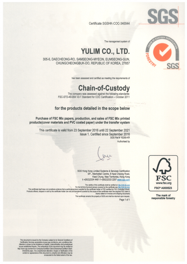 Yulim has achived FSC® COC C132288 certification on Nov, 2016.